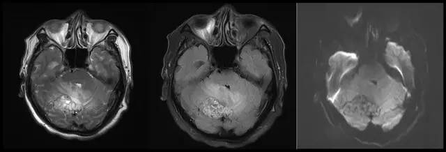 3. 实质型:该型MRI表现不典型,诊断较困难。主要特点是:肿瘤外形规则、边界清楚,呈圆形或类圆形,血供丰富。T1WI呈略低或等信号,T2WI均为明显高信号,少数T1WI可见点状高信号,可能瘤内亚急性出血或含较多脂基质细胞,含脂基质细胞是血管母细胞瘤特点之一。