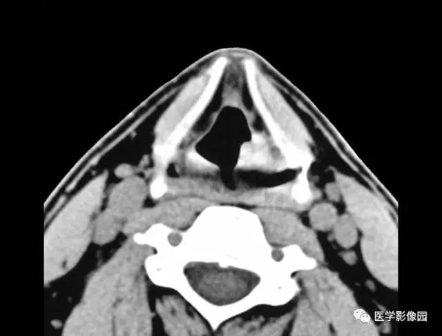 2.早期微小病变不易发现,随着病变发展可见喉前庭处或声门下区边界清楚的软组肿块影,病灶可有钙化。