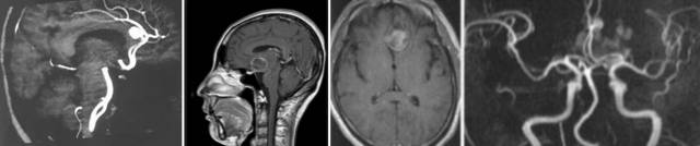 MRI平扫:动脉瘤瘤腔内的血流呈“涡流”现象,在MRI上表现为无信号或低信号,但若动脉瘤腔内部分形成血栓,则信号改变就变得复杂化了。血栓中的正铁血红蛋白表现为高信号,若含有含铁血黄素则表现无或低信号;残留的瘤腔仍有流空效应,表现无或低信号;动脉瘤周边可有出血和水肿。