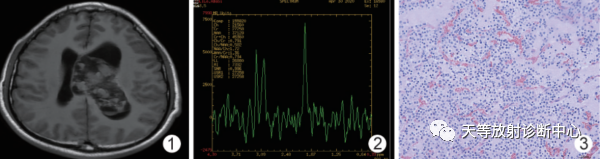 图1 MRI显示左侧脑室前部见一囊实性异常信号,以实性成分为主,T1WI 为等、稍低信号 图 2 肿瘤区域波普显示胆碱峰明显增高 图 3 肿瘤细胞毛玻璃样胞质,核偏位,其围绕小血管呈假菊形团结构。