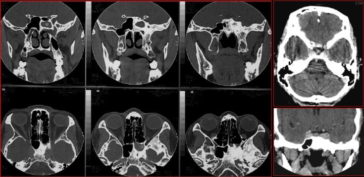 ◆ 发展致骨壁破坏溶解,引起眶内或颅内并发症