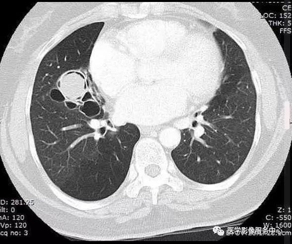 CT:右肺中叶见一个球形软组织密度影,周围见空气新月征