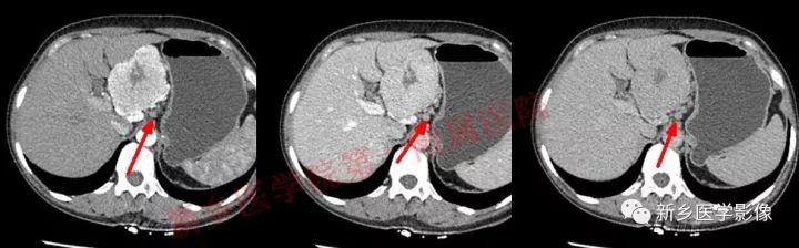 肝胃间胰腺前上方见类圆形肿块,边界较清,大小约8.2cm×4.6cm×5.9cm,密度欠均匀,内见点状钙化,增强呈不均匀明显强化,内见片状低密度灶无强化区,其下部与相邻胰腺分界不清,周围见粗大回流血管影回流至门静脉,病变左侧及腹膜后、胃壁小弯侧见数个卵圆形稍大淋巴结及结节影,部分呈环形强化。