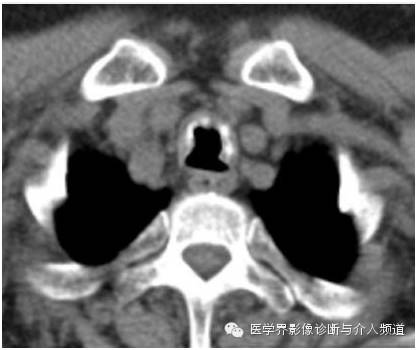 CT主要表现为在气管支气管前壁和侧壁黏膜下散在或多发分布斑点钙化状小突起,突向管腔,大多数突起直径在 1~3 mm,但有的结节较大,达到10 mm。一般黏膜下高密度钙化状影和气管环不连接。