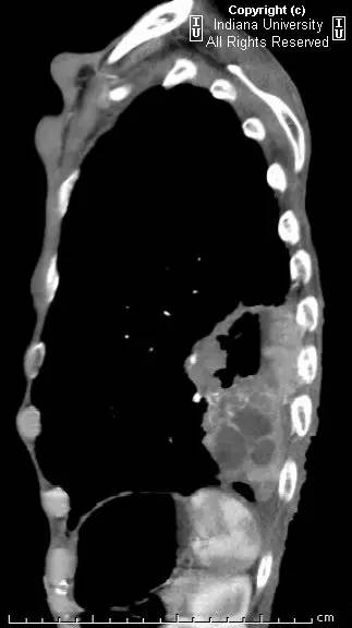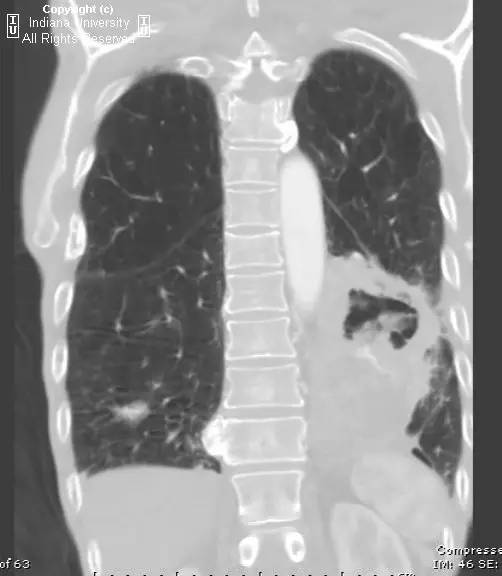 胸片示肺内高度膨胀性病变,膈肌扁平。左后胸部可见较大卵圆形不透亮区并液平面。CT示左肺下叶近后胸壁较大厚壁肿块并部分空洞形成,实性部分不均质强化。右肺下叶可见分叶状结节。左前下少量气胸。
