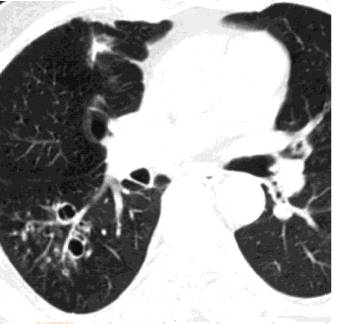 由于扩大的细支气管呈分支并有成边缘模糊结节的细支气管周围炎症,它的表现类似发芽或长果子的树。