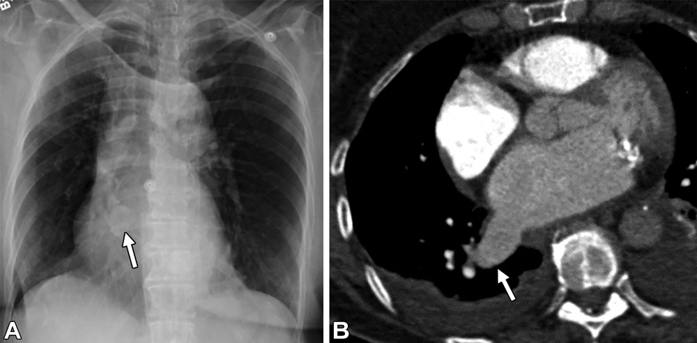 肺静脉曲张。54岁男性,胸片异常。(A)前后位胸片可见右肺下叶异常扩张的血管结构(白色箭头)。(B)轴位CT增强图,可见右肺下叶肺静脉曲张。