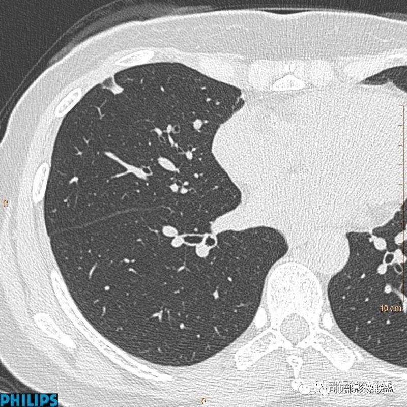 长径均小于12mm。典型的形状为三角形,也可以为梭形、圆形或椭圆形。诊断的关键在于见到1-5条细线与胸膜、叶间胸膜或静脉相连,有时状如坐落于电路板的“二极管”,但以薄层CT显示为佳。有作者病理对照线状影为小叶间隔,有作者病理对照为淋巴管。其实不矛盾,因为淋巴管走行于小叶间隔内。