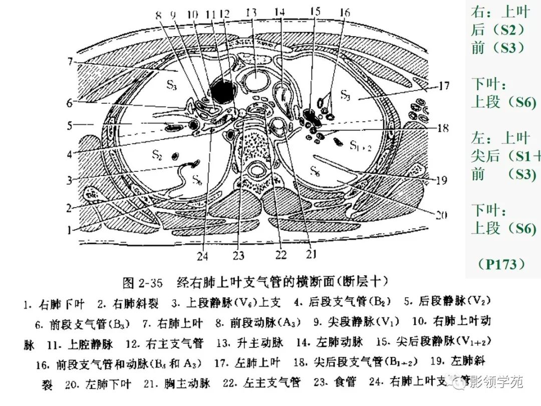 气管杈出现,其右侧有奇静脉弓汇入上腔静脉,奇静脉弓可视为右肺门出现的标志。(10个断层)