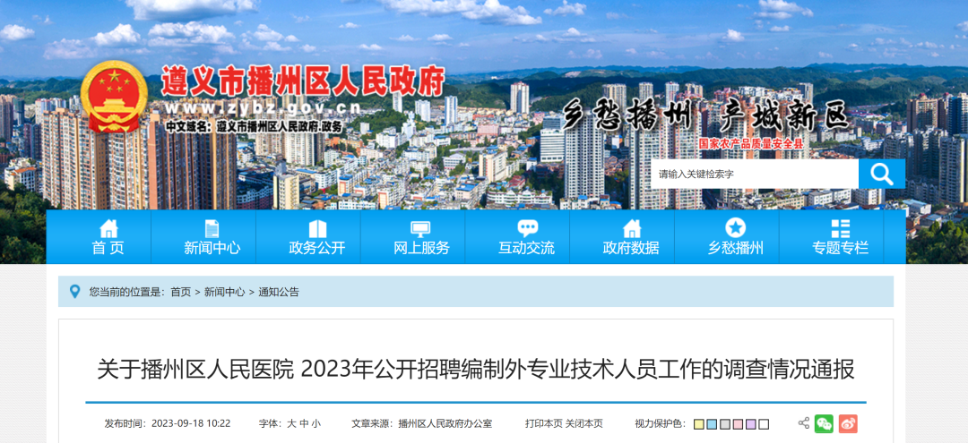 9月18日,贵州省遵义市播州区政府官网发布《关于播州区人民医院2023年公开招聘编制外专业技术人员工作的调查情况通报》,通报全文如下: